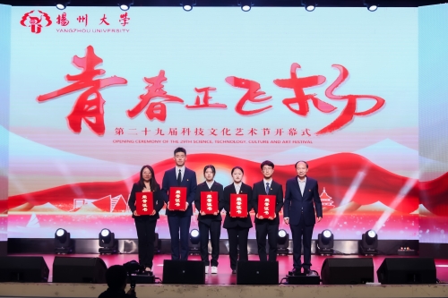 5月8日晚,第29届科技文化艺术节开幕式暨“青春正飞扬”文艺汇演在文汇路校区大礼堂举行。校党委书记焦新安,校长丁建宁,校纪委书记、派驻监察专员邱庆峰等领导出席活动并为获奖代表颁奖。副校长、科技文化艺术节组委会主任蔡颖蔚致开幕词。