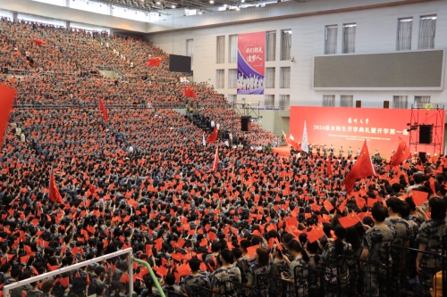 开学典礼上,学校举行了盛大的迎国旗、唱国歌仪式。在今年建校122周年之际,经学校申请和天安门管委会审批,我校获赠了今年校庆日当天(2024年5月19日)在天安门广场升挂的国旗,国旗编号为2024-0140。典礼现场,校国旗护卫队队员手捧国旗和证书列队入场,9000余名师生迎接国旗,齐唱国歌。整场仪式庄重而热烈,最后师生们以汹涌澎湃的爱国情怀共同唱响《歌唱祖国》。一瞬间,现场变成了国旗的海洋,不少师生热泪盈眶,爱国主义精神激荡在每一个扬大人的心胸。