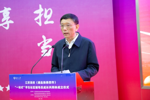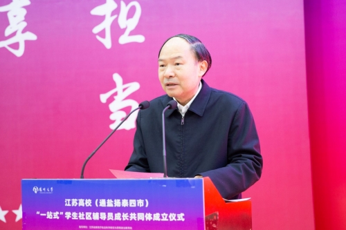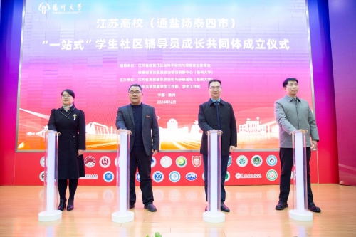 12月20日上午,江苏高校(通盐扬泰四市)“一站式”学生社区辅导员成长共同体成立仪式在学校荷花池校区逸夫图书馆报告厅举行。省委教育工委副书记、省教育厅党组成员潘漫到会讲话,校党委书记焦新安出席并致辞。副校长蔡颖蔚主持会议,省教育厅社政处处长邹燕、一级主任科员陈磊,教育部高校思政工作队伍培训研修中心(扬州大学)主任叶柏森等出席活动。