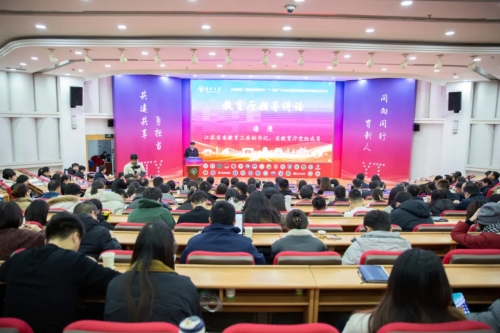 焦新安介绍了学校校史校情、办学成就以及学生思想政治工作情况,并就深化大学生思想政治工作和共同体建设提出倡议,要坚定政治方向,打造一个让党放心的“成长共同体”;要强化协同联动,打造一个互动有为的“成长共同体”;要深化自身建设,打造一个先锋示范的“成长共同体”。