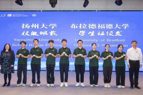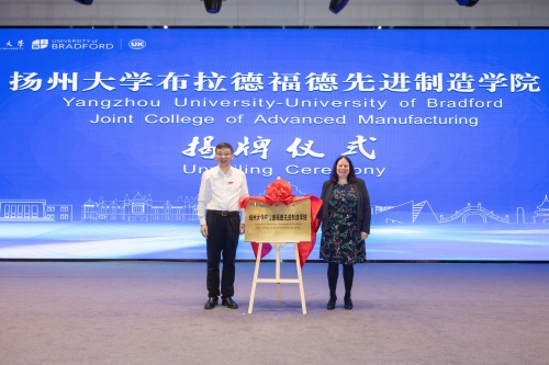 两校代表共同为“扬州大学布拉德福德先进制造学院”“布拉德福德大学师生服务中心”“扬州大学-布拉德福德大学跨文化交流中心”揭牌,并为新生代表佩戴扬州大学校徽,颁发布拉德福德大学学生证。