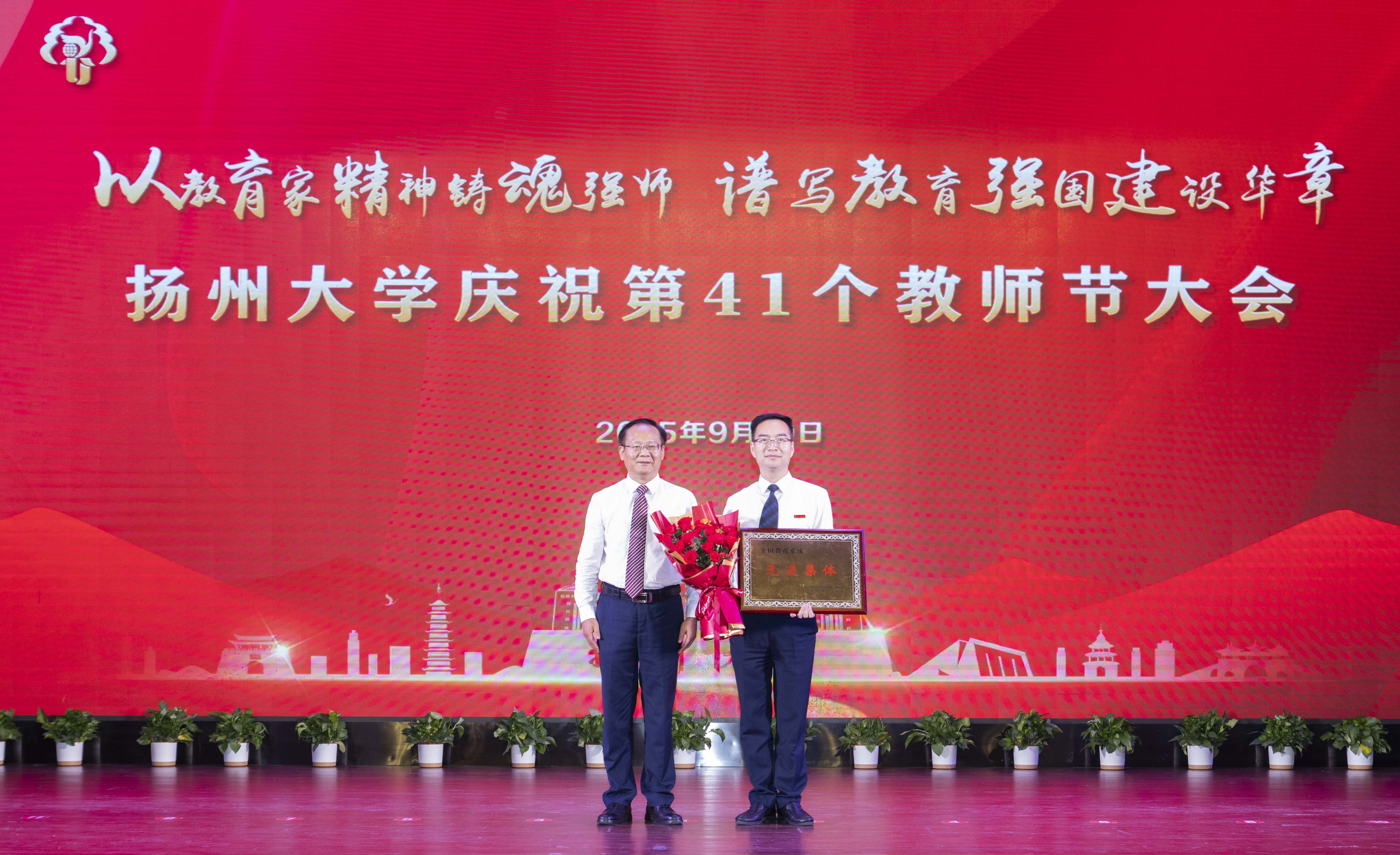 9月10日下午,学校在文汇路校区大礼堂隆重举行庆祝第41个教师节大会,表彰第四批“全国高校黄大年式教师团队”创建示范活动入围团队、全国教育系统先进集体等一批先进典型。校党委书记丁建宁、校长刘巧泉为获奖者颁奖并合影留念。刘巧泉发表讲话。校党委副书记周如军主持大会,蒋乃华、赵文明、王承堂、邱庆峰、韩杰、蔡颖蔚等校领导出席大会并为有关获奖者颁奖。中国工程院院士、农学院教授张洪程出席大会。