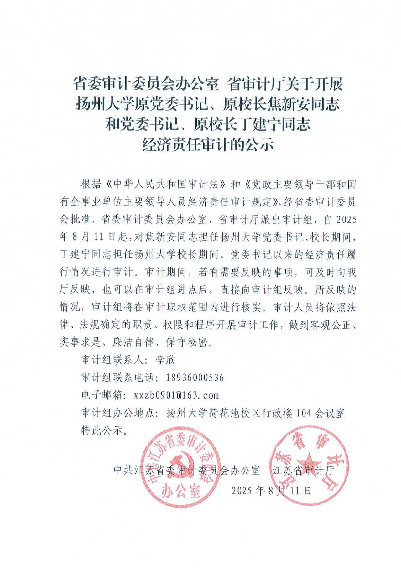省委审计委员会办公室 省审计厅关于开展扬州大学主要领导经济责任审计的公示