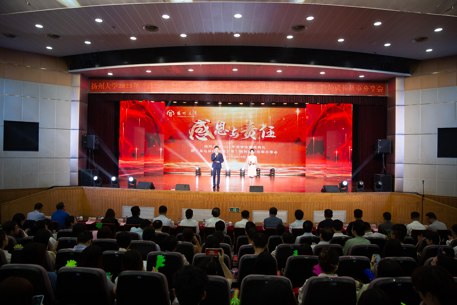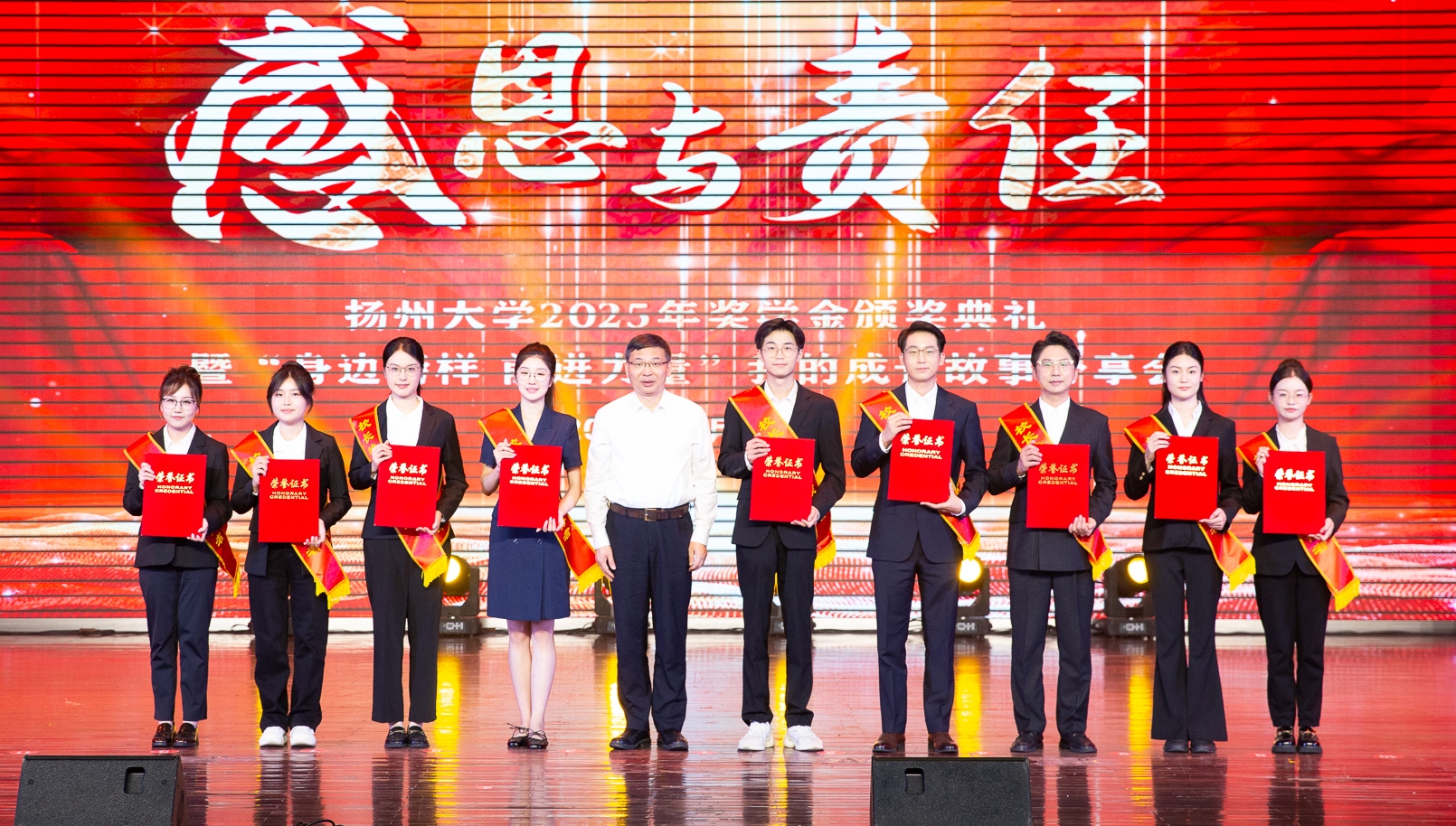 颁奖典礼共分为“立大德·坚苦自立”“明大智·实学研攻”“成大气·建业寰中”三个篇章。在故事分享环节,9名校长特别奖学金获得者以视频展示、人物访谈、嘉宾寄语等形式讲述了各自的青春故事,诠释了“大德、大智、大气”的精神内涵,与会师生共同见证了扬大学子用笃实行动践行责任担当的精神风貌。